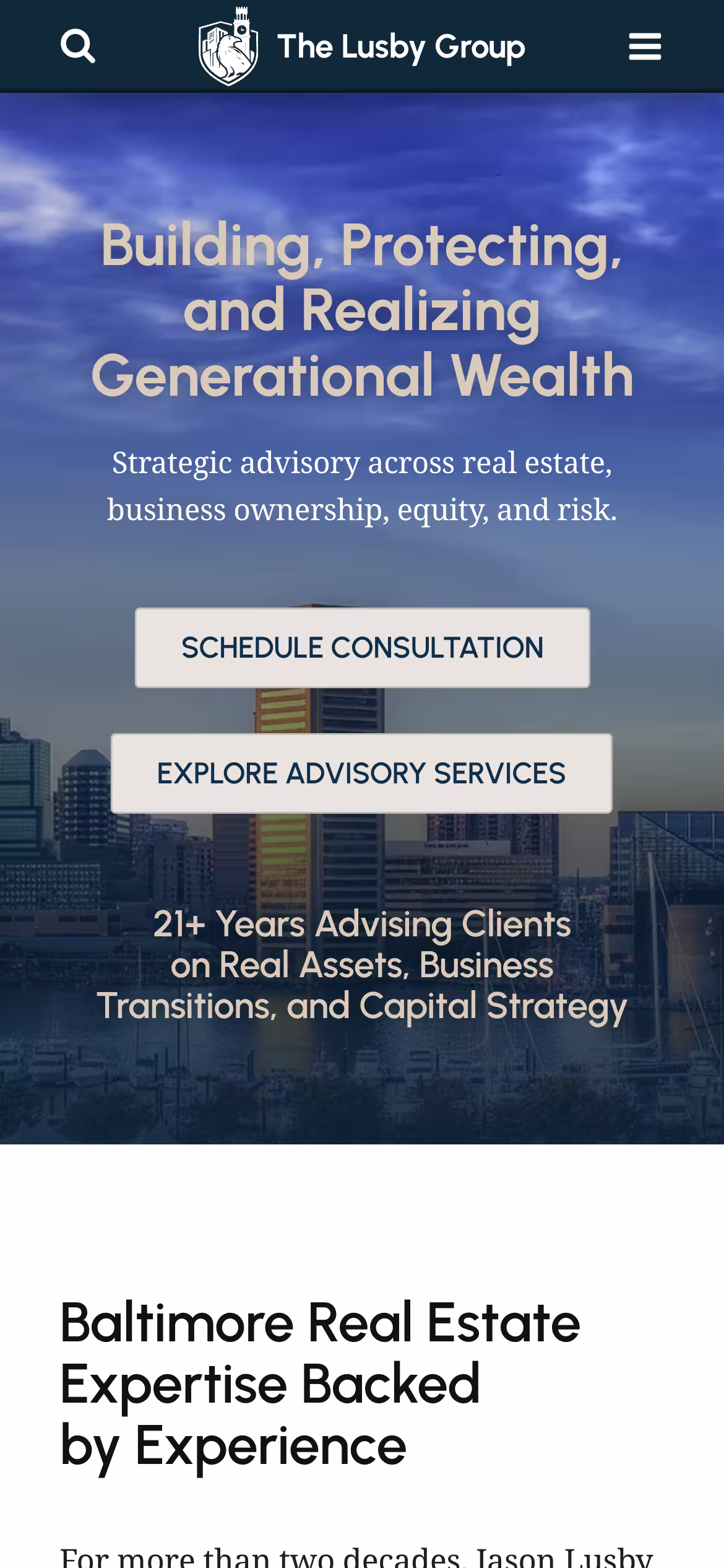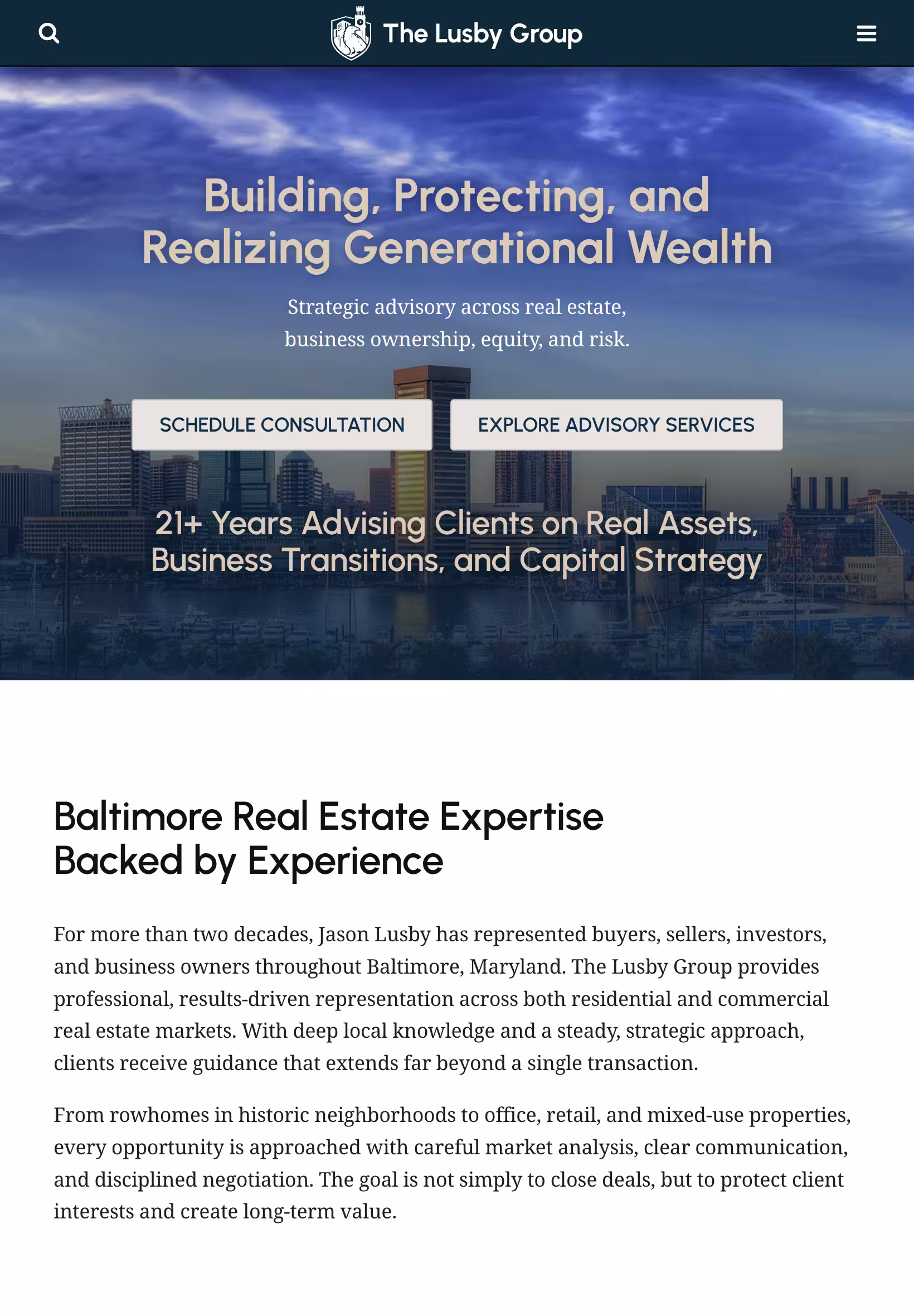 From the outset, the project required more than a standard real estate template. The Lusby Group’s services extend beyond traditional buying and selling, incorporating advisory-level offerings such as commercial representation, business brokerage, and long-term exit strategy planning. The site needed to communicate this broader positioning clearly, without overwhelming users or sacrificing usability.